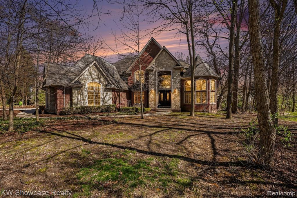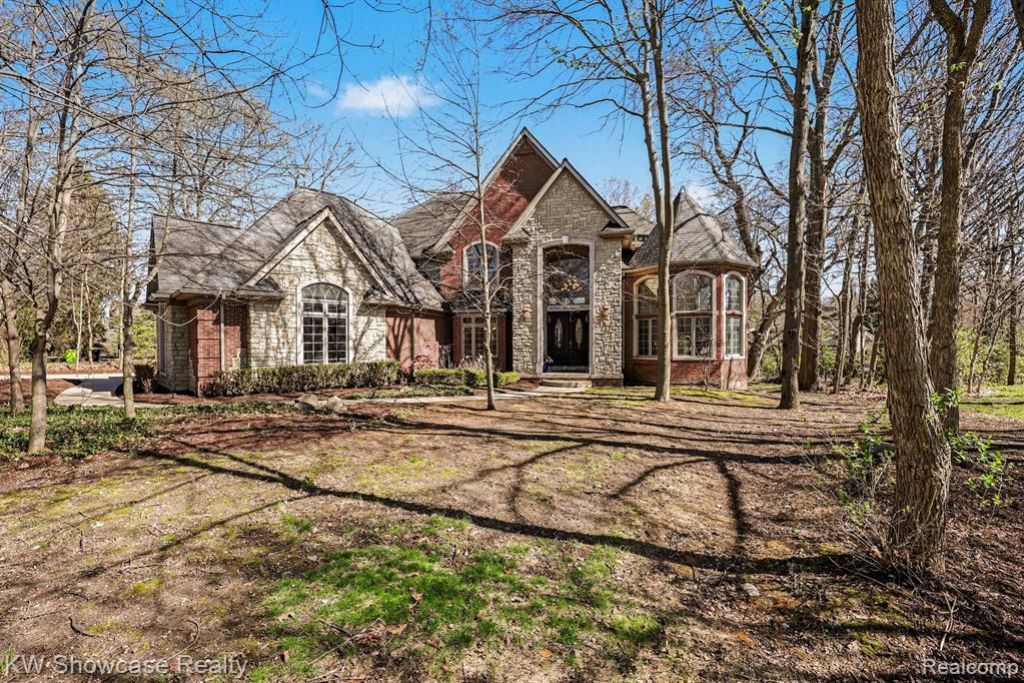 This elegant traditional colonial home is situated in the prestigious Andover Point subdivision on a beautiful, wooded half-acre lot in a private cul-de-sac. With no HOA and highly rated Novi schools, it offers privacy, serenity, and an outstanding location. The grand two-story foyer greets you with a dramatic wrought-iron spindle circular staircase and a second staircase. Rich Brazilian cherry hardwood floors and custom intricate moldings complement soaring vaulted ceilings and an open floor plan perfect for daily living and entertaining. The living room is distinctly designed as a turret room with an impressive 20-foot ceiling, creating a unique focal point. Adjacent is the spacious great room with soaring vaulted ceilings and a striking double-sided gas fireplace. The gourmet kitchen features granite countertops and a walk-in pantry, while a formal dining room, first-floor office, laundry, and powder room (across from the office) complete the main level. Upstairs, the luxurious primary suite includes its own gas fireplace, an oversized walk-in closet, and a spacious primary bathroom with room for dual vanities, a soaking tub, and a separate shower. Three additional bedrooms—including one currently used as a theater room—plus two full baths offer excellent flexibility. The lower level features an expansive unfinished walkout basement with nearly 2,000 square feet of potential, tall ceilings, and plumbing ready for a future bathroom. Additional highlights include an energy-efficient Carrier Infinity furnace with electric heat pump and natural gas backup, plus a whole-house natural gas generator. The massive 1,126-square-foot garage is a car collector’s dream, accommodating up to 5 vehicles with ample storage and a 40-amp receptacle. This exceptional home combines grand scale, custom details, and modern comforts in a spectacular private wooded setting. Must be seen to be fully appreciated.
